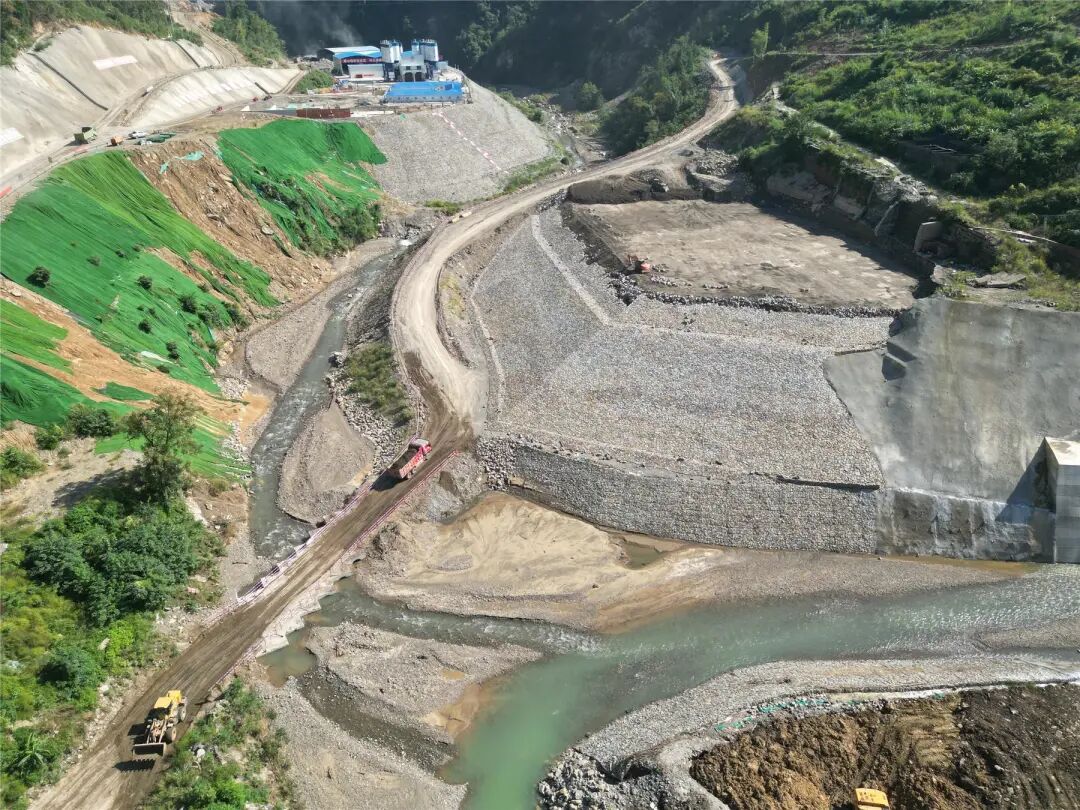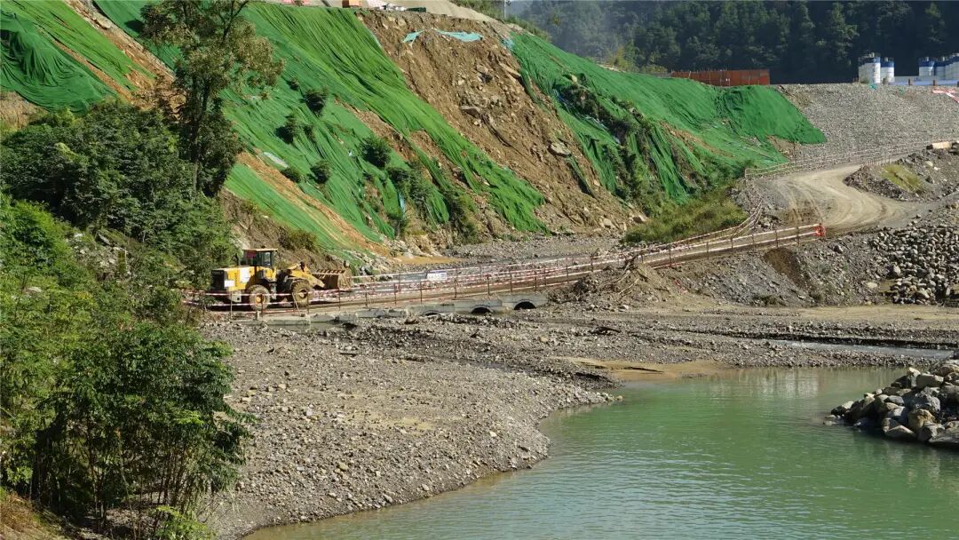 大型挖掘机挥舞着铁臂,在坝基处精准作业