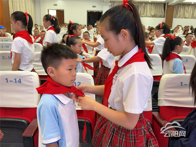 活动在节目《追梦传承》的精彩表演中拉开序幕。随后,伴随着激昂的出旗曲,标准化入队仪式示范活动正式开始。旗手们高举中国少年先锋队队旗,迈着整齐的步伐走向舞台。佩戴上鲜艳的红领巾,新队员们高举右拳,在队旗下庄严宣誓:“我是中国少年先锋队队员...”稚嫩而坚定的声音,展现了新时代少先队员的精神风貌。