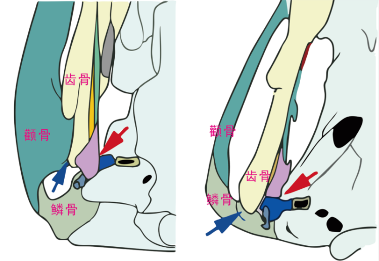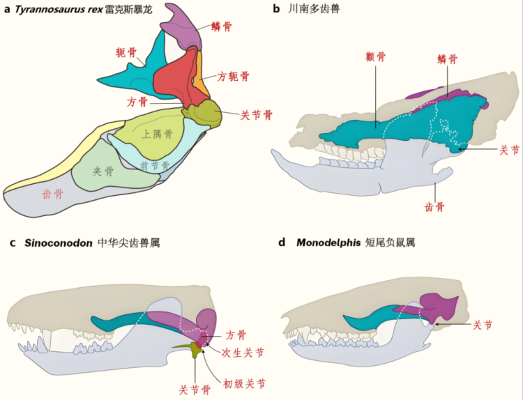 哺乳动物的齿骨和鳞骨构成的颌关节(“齿骨—鳞骨”关节)是其关键性特征之一。这一革命性结构,使得哺乳动物颌关节(下巴)能进行复杂的前后、左右以及旋转运动,从而实现高效咀嚼,促进了哺乳动物的崛起。