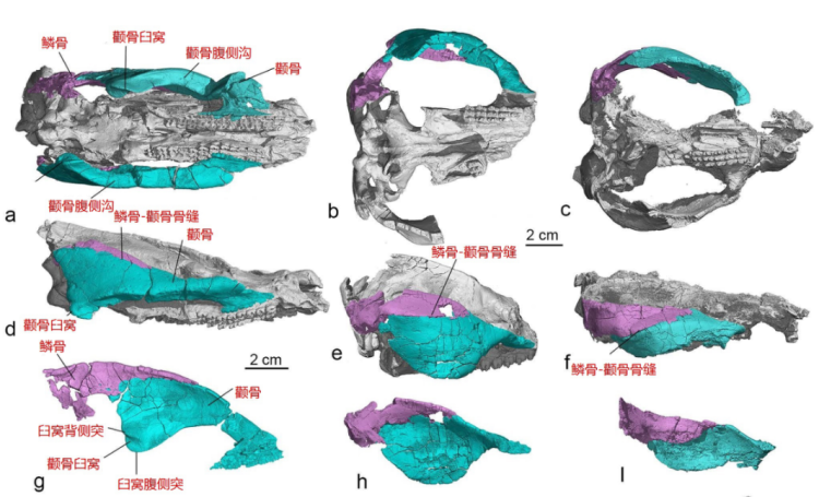 川南多齿兽和云阳的似卞氏兽未定种(中侏罗世下沙溪庙组)的颅骨特征对比。 (a—c,川南多齿兽、云阳的似卞氏兽(b, 16YPDC—01;c,19YP—67)颅骨腹面观。d—f,a—c中相同标本的侧面观。g—i,由颧骨和鳞骨形成的颧弓内侧观)