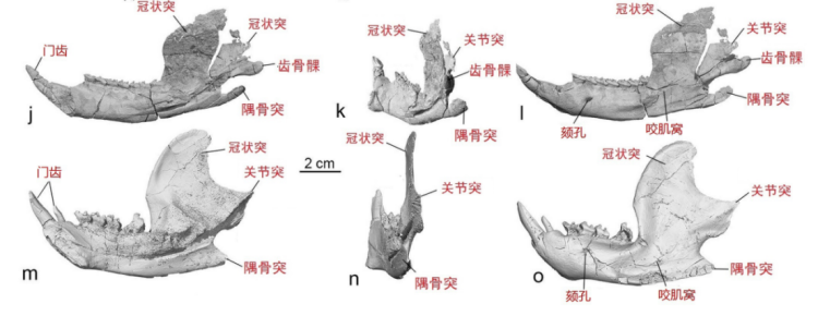川南多齿兽演化出全新的次级颌关节类型(“齿骨—颧骨”关节)。该关节与哺乳动物典型的“齿骨—鳞骨”关节不同,而是由下颌齿骨(主要承载齿列的骨骼)后部向上延伸形成的齿骨髁,与头骨侧面的颧骨(俗称“脸颊骨”)的臼窝嵌合构成,呈“滑车”式结构。研究人员推测,该特殊颌关节结构可能为支撑其超长齿列、适应掘穴生活的功能特化表现,是三列齿兽类演化过程中一次重要的“结构—功能”创新。