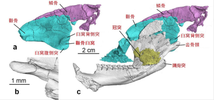 川南多齿兽的颌关节特征。 (a, 颧弓和颧骨臼窝的内面观;b, 齿骨髁的侧面观;c,下颌骨和颧弓的内面观)