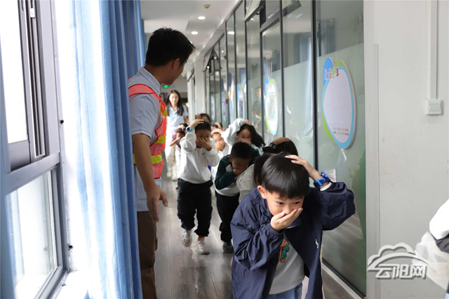随着急促的警报声响起,紧张的氛围瞬间弥漫开来,演练正式开始。各班学生在老师的引导下,纷纷捂住口鼻、弯腰低头,按照预先规划的疏散路线,从安全出口快速、有序地撤离“火灾”现场,到达安全区域。