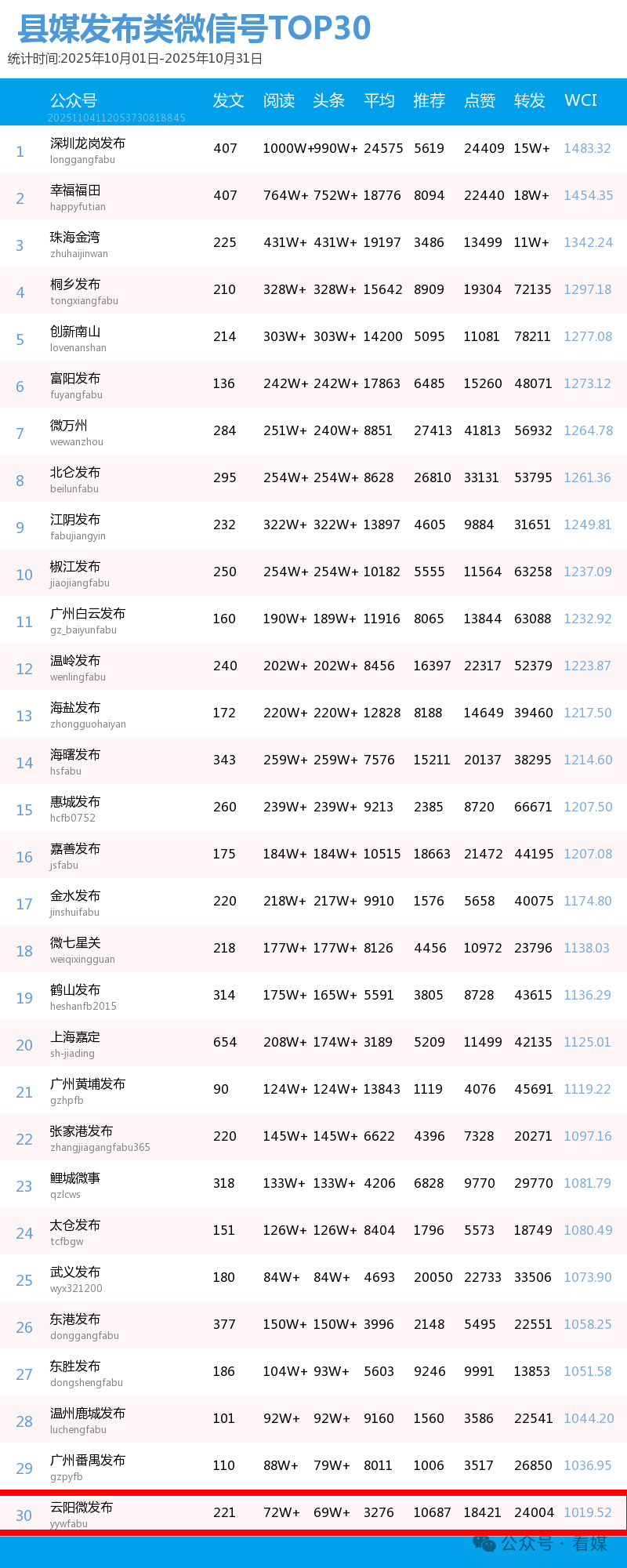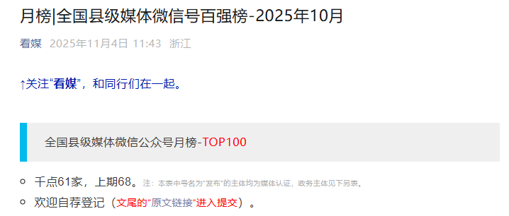 全国县级媒体微信号百强榜由业内公认的指数平台清博指数(gsdata.cn)提供数据支持,根据数据监测,从微信公众号推送文章的传播度、覆盖度及公众号的成熟度和影响力等方面,以微信传播指数(WCI)对全国县市区级媒体微信公众号进行数据监测和综合排名。榜单由“看媒”(微信公众号:meitimeiti,原“广电新媒体”)发布。