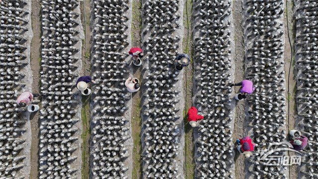 走进基地,菌棒整齐排列,肥厚饱满的黑木耳从菌棒上生长而出,村民们分散在田间地头,熟练地进行采摘,现场一片繁忙。