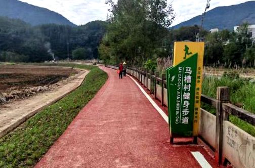该健身步道起点位于铁桥,终点至马槽村3组,全长800米,宽3米,路面宽敞平整,既兼顾了锻炼的舒适度,又保证了安全。步道一侧为河边,无论是清晨的慢跑,还是傍晚的散步,村民都能在健身步道上享受到户外休闲健身的美好宁静。