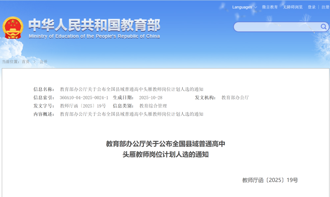 教育部启动实施全国县域普通高中头雁教师岗位计划,旨在培养一批县域普通高中领军教育教学人才。鼓励他们建立工作室,运用人工智能等数字化教学手段,促进普通高中教育振兴和高质量发展。头雁教师由政治素质过硬、业务素质精湛、育人水平高超、组织协调能力突出的县中优秀教师担任。教育部将搭建交流成长平台,成立县域内学科专业发展共同体,支持头雁教师开展有组织科研,创新教育理念,钻研教学方法,辐射带动县中教师队伍建设。