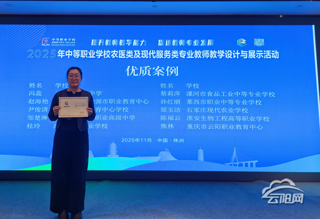 云阳网讯(通讯员 张小林 夏晨)11月17日,2025年全国中等职业学校农医类及现代服务类专业教师教学设计与展示活动在株洲闭幕。云阳职教中心园艺技术专业教师熊林凭借其精心设计的《枇杷灰斑病精准识别与绿色防治》教学方案,获评农林类优质案例。