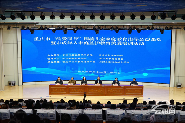 云阳网讯(记者 王月园 实习生 杨靖宇)11月21日,重庆市“渝爱同行”困境儿童家庭教育指导公益课堂暨未成年人家庭监护教育关爱培训活动在云举行。重庆市教育科学研究院德育研究所所长、重庆市家庭教育研究中心副主任谭舒予,县人大常委会副主任张建才出席活动。