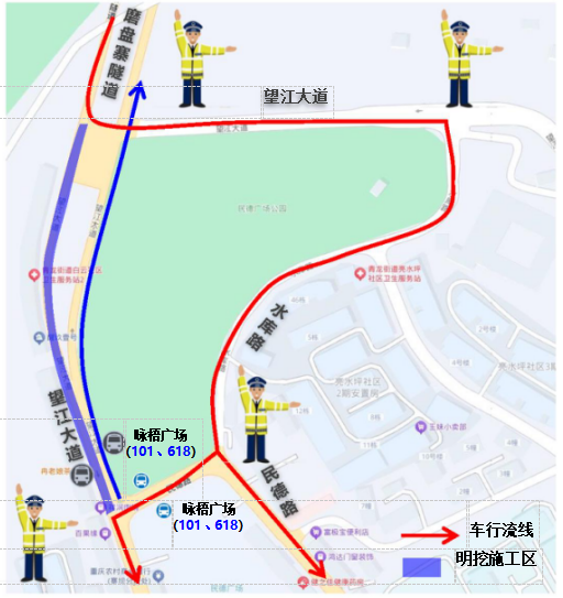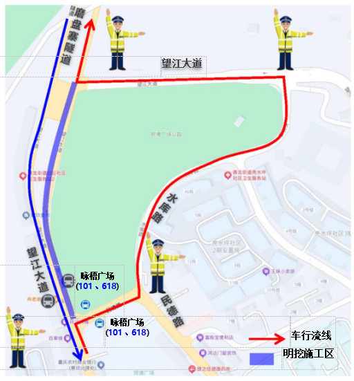 社会车辆组织:南→北方向车辆维持现状运行;北→南方向车辆通过望江大道—水库路—民德路/望江大道绕行,绕行距离约500m。双向车流于磨盘寨隧道南端存在冲突,通过交通维护人员指挥通行。
