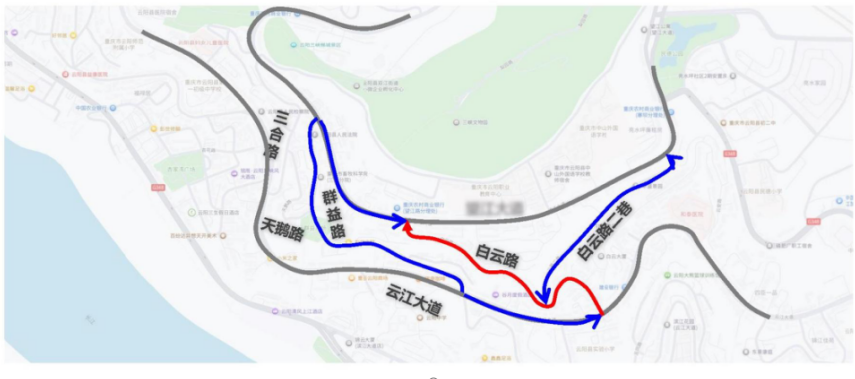 绕行线路:原白云路车流,通过望江大道—群益路—云江大道、望江大道—白云路二巷—云江大道绕行。