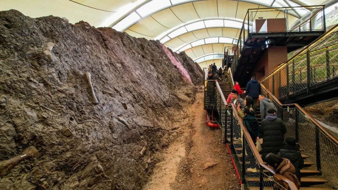 游客在云阳世界地质公园参观恐龙化石墙。图/王全超