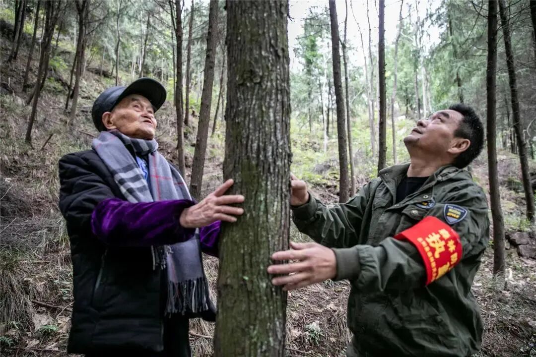 2024年11月19日,在云阳县长江林场,80多岁的牟方坤在儿子牟伦奎的陪同下,来到林场中,他亲手栽植的小树苗已长成了参天大树。图/刘兴敏