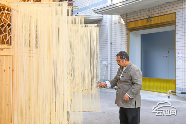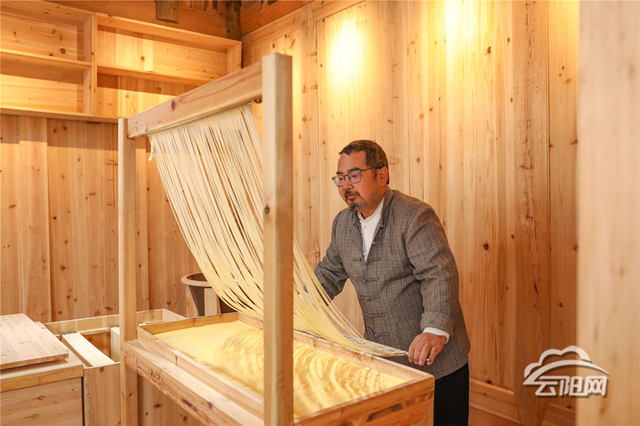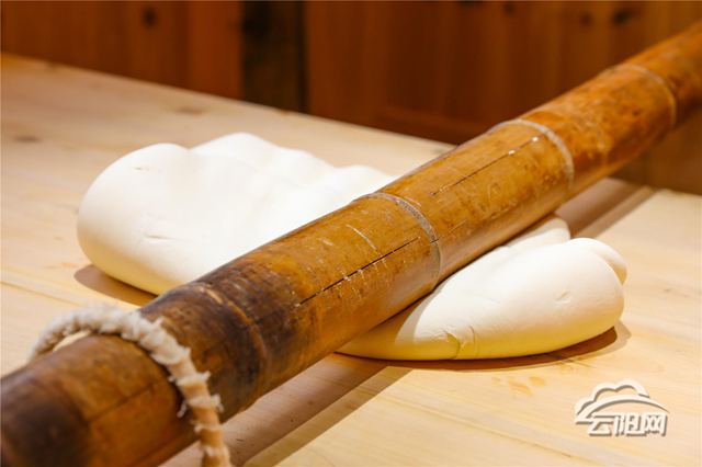 “巴阳山上的杠子面,压呀压成坨,世代永相传呐,慢慢儿听我说......”在“巴阳杠子面大师工作室”里,正传出阵阵歌声。巴阳杠子面非遗工坊第三十七代传承人刘益在欢快的歌声中,用竹杠反复压制面团,他还详细介绍着现在杠子面的每一个制作流程。
