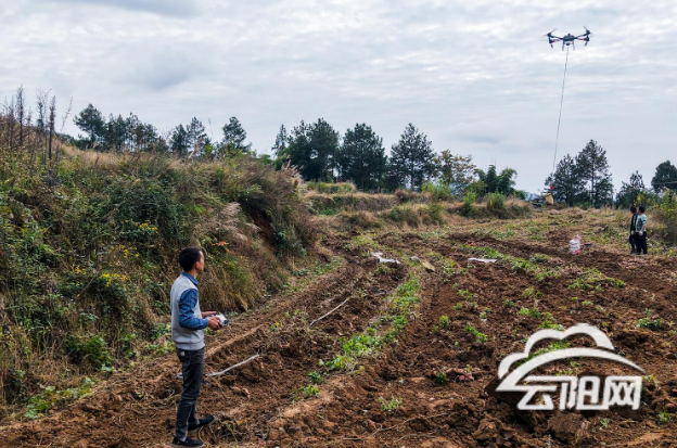 在云阳镇三坪村的丘陵红薯田里,传统的采收景象正在改变。地面上,改良后的收割机沿着田垄深耕,将红薯从土中翻出;天空中,无人机穿梭往返,用吊索将装满红薯的筐篮稳稳运送到田边的运输车上。
