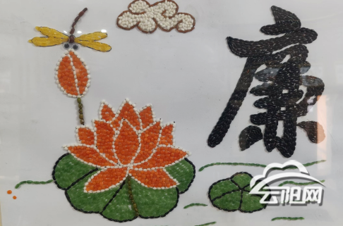 其中一幅作品尤为引人注目:米粒组成的“廉”字端正有力,周围点缀着亭亭荷花、徐徐清风与悠然白云。荷花出淤泥而不染、白云洁净无瑕,共同构成了一幅寓意深远的廉洁画卷。