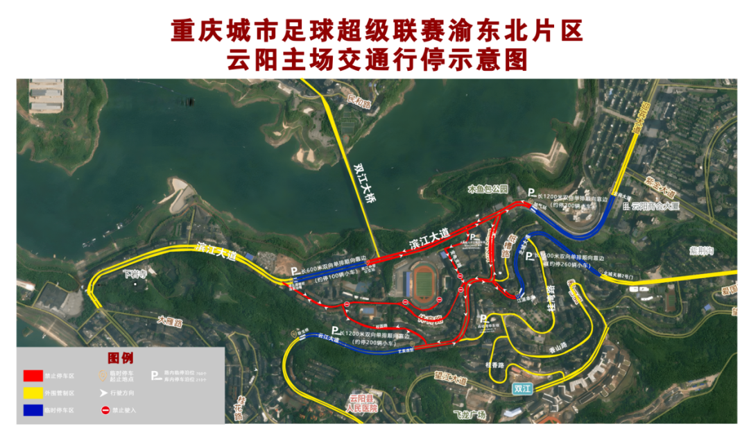 (二)禁止停车路段:体育路、桂圆路、变电站支路、滨江大道双中公交站至加气站段、云江大道特殊教育学校转盘(原大发汽修厂)至加气站全段、北城大道小石板红绿灯路口至江源串串段。以上路段禁止停放车辆。(下图红色区域)