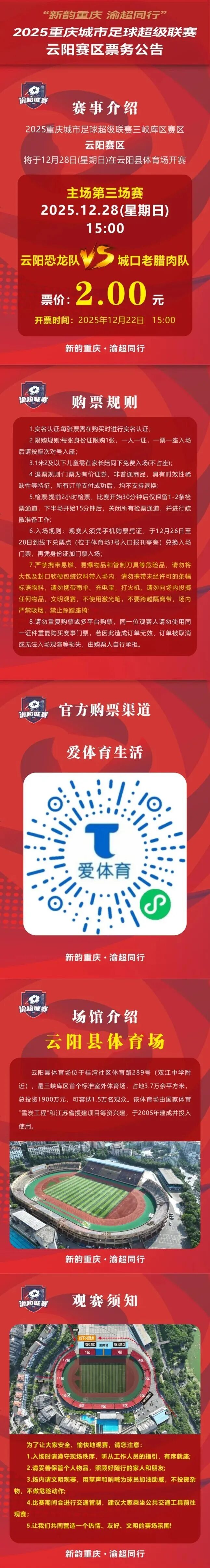 备注:若上半场出现0:0比分,则在中场休息时间只抽1轮奖,抽中的3名幸运观众将获得1年云阳指定景区无限次入园权益。
