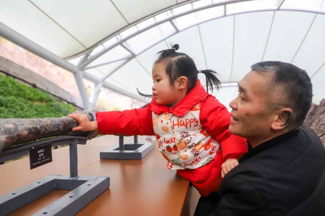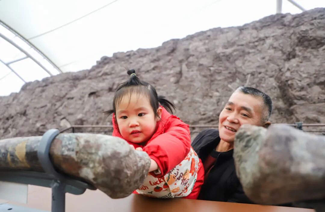 众多家长带着孩子近距离观察亿年前的恐龙化石