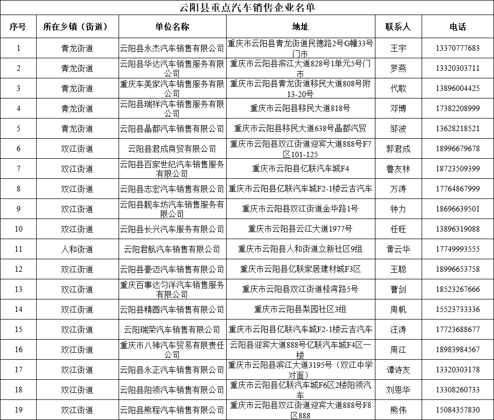 云阳县重点汽车销售企业名单