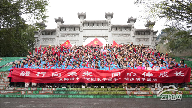 云阳网讯(记者 王维立)1月5日,云师附小组织六年级师生开展了“党团队手拉手”徒步研学活动。本次活动以“快乐毅行、协作抗压”为主线,师生们从学校出发,徒步抵达云顶广场,并在广场集中开展了一系列丰富多彩的团队趣味活动。