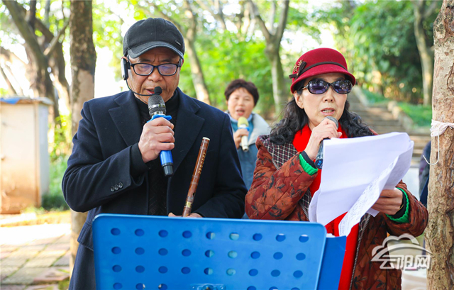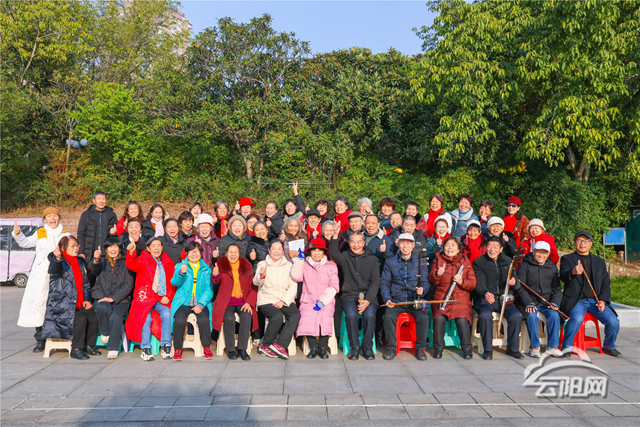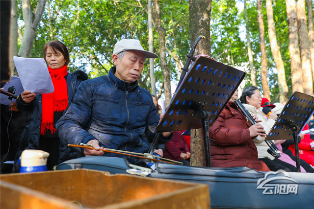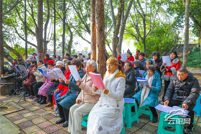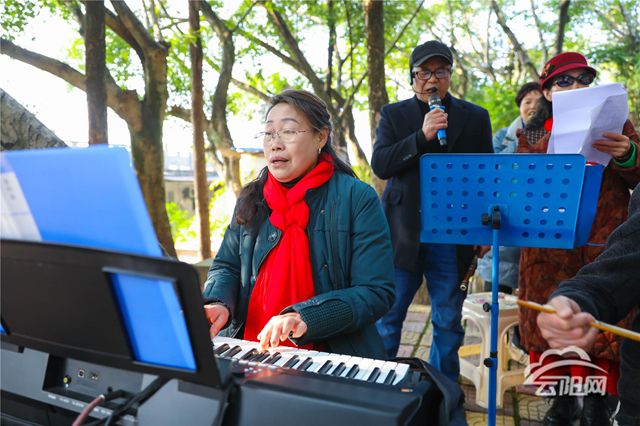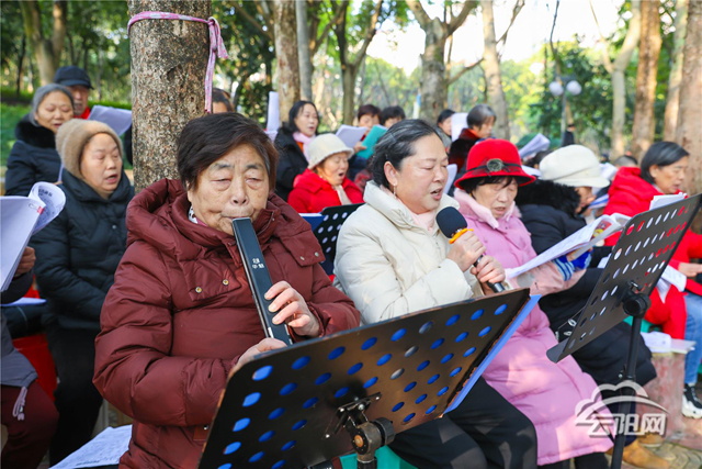 在杏家湾广场,近百名歌咏爱好者会聚树荫下,手持歌谱,神情专注。二胡、笛子、电子琴、电子管等乐器默契配合,为整齐的歌声铺设悠扬的旋律背景,随后他们带来了《幸福花开好运来》《蓝色的蒙古高原》《乡村放歌》《人民共和国》《我唱赞歌献祖国》等精彩的歌曲表演。冬日午后的阳光透过枝叶,温柔地洒在他们洋溢着笑容的脸庞上,也落在伴奏者面前的琴键与话筒上,泛着金色的光芒。