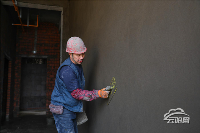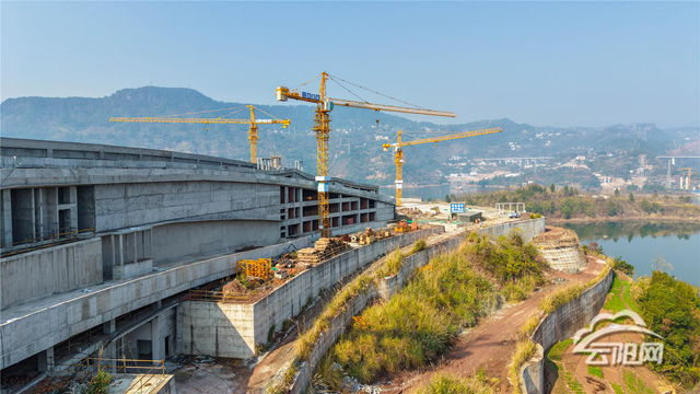 在云阳旅游集散中心及云阳博物馆建设现场,塔吊有序运转,工程车辆往来穿梭,已完成封顶的主体建筑巍然矗立,施工人员正在进行外墙抹灰与防水作业。室内场所中,水电管线铺设、墙体抹灰等工序同步展开。