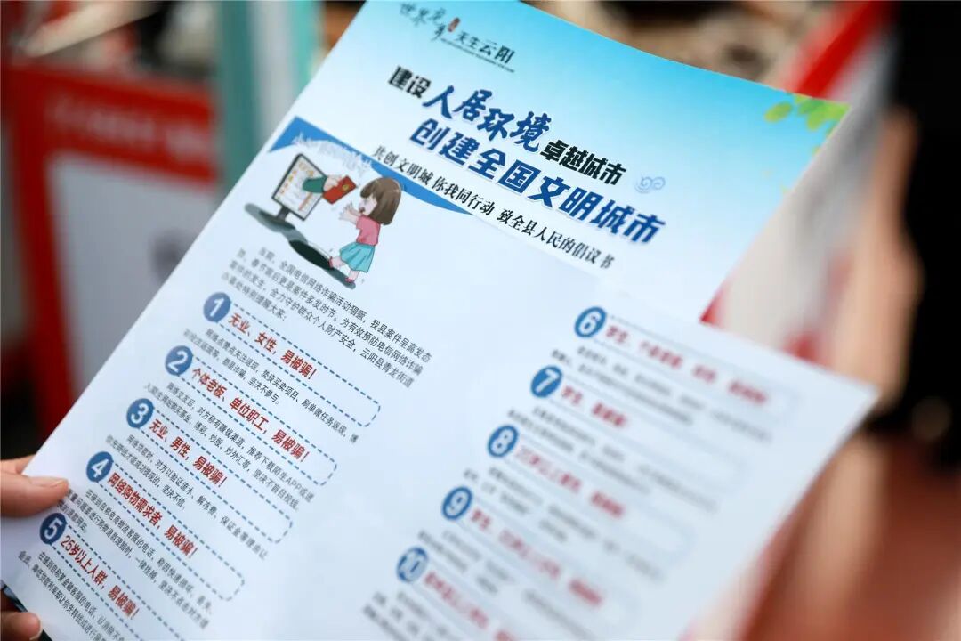 工作人员热情地向周边群众发放创建文明县城倡议书