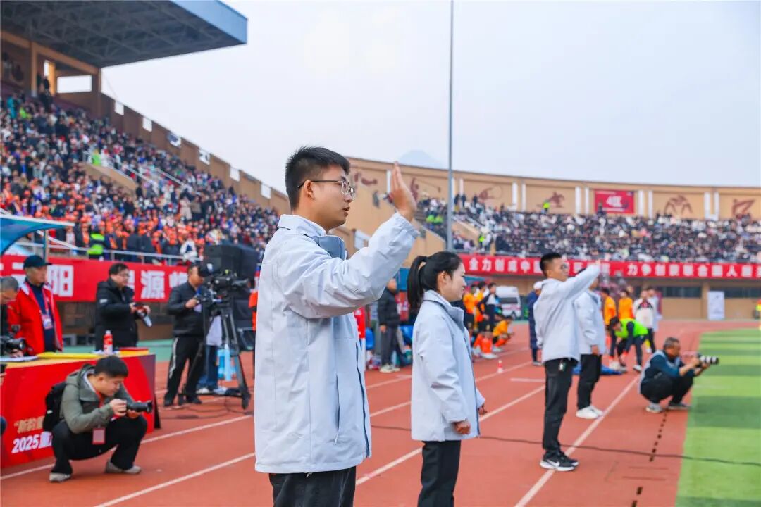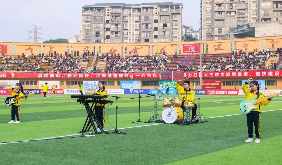 “夜空中最亮的星,能否听清……”“渝超”联赛中场休息,清亮稚嫩的歌声在绿茵场响起,表演者是4名身着校服的孩子。不远处,4名老师站成一排:抬手,是和弦;挥臂,是节拍。他们互相配合,共同奏响悠扬的旋律。