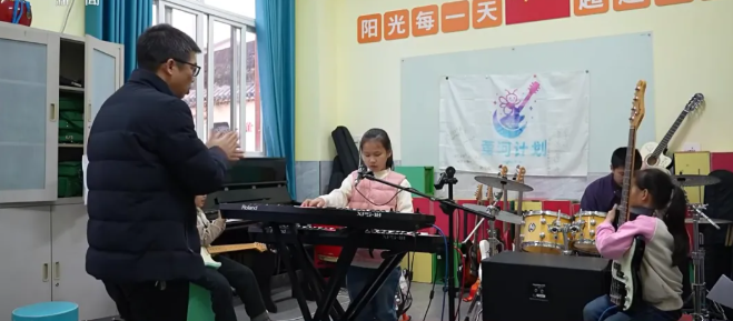 2025年5月,他拉上另外3名老师,共同组建了“萤河计划”乐队。“我们想把不同类型的孩子组合在一起,发挥他们各自的长处。”指导老师陈旭东说,“当然,更想让他们在音乐里找到乐趣。”