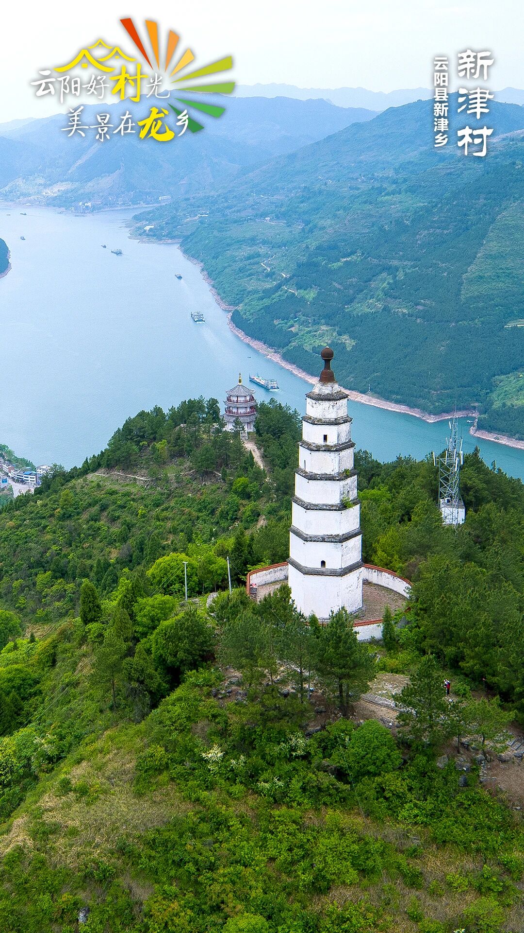 云阳县新津乡新津村坐落在长江与磨刀溪的交汇口,历史上作为川盐入楚的关键中转站而繁荣一时,因盐运之利,崛起为长江沿线举足轻重的水陆码头,素有“上有重庆朝天门,下有云阳新津口”的说法。谭家山山顶的文峰塔历史悠久,为县级文物保护单位,素有“宝塔舟侧”之美誉。长江边上桃花岛三面环水,风景独特,诗意盎然,宛若世外桃源、山水画卷。
