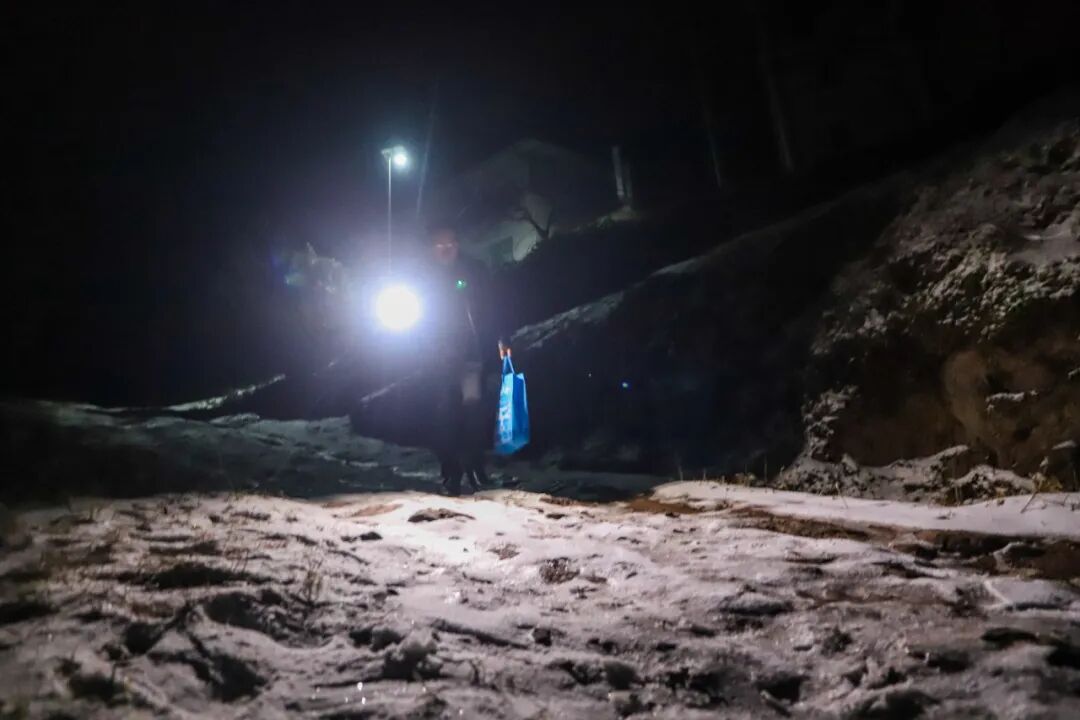山路如墨色丝带般蜿蜒伸展,头灯的微光勉强撕开身前的夜色,也照亮前方飘落的雪花。平时三四十分钟的路程,这晚因道路太滑,硬是骑了一个钟头。雪很快覆上他的头发和肩膀,他仍把药箱护在胸前,尽量不让药品受潮。