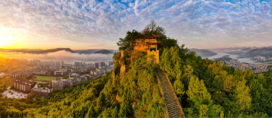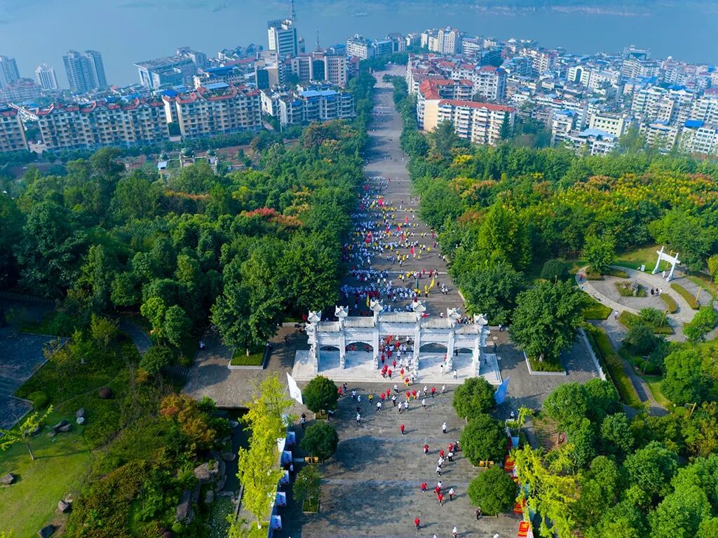 1999级登云梯从山脚蜿蜒到山顶,爬到顶端回望,长江像条银带绕城而过,城市风光尽收眼底。