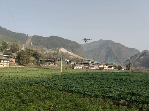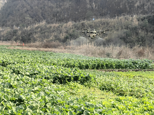 云阳网讯(通讯员 周欢 霍希妮)目前,江口镇向家坪社区、新华村、五星村千亩油菜已进入蕾薹期,连片的油菜长势喜人,正值油菜田间管理的关键时期,为确保油菜稳产增收,近日,镇产业发展服务中心积极行动,组织技术人员深入田间地头,全面摸排油菜长势及病虫害发生情况,根据苗情制定针对性防治方案,安排专业队伍开展无人机飞防作业。相较于传统人工防治,无人机飞防作业效率高,喷洒均匀,省时省工,还能不损伤苗情,此次飞防作业主要针对现阶段油菜面临的防冻需求及菌核病等常见病虫害问题。通过科学配比磷酸二氢钾、硼肥、菌核净等药剂,实现“一喷多防”的综合效果。