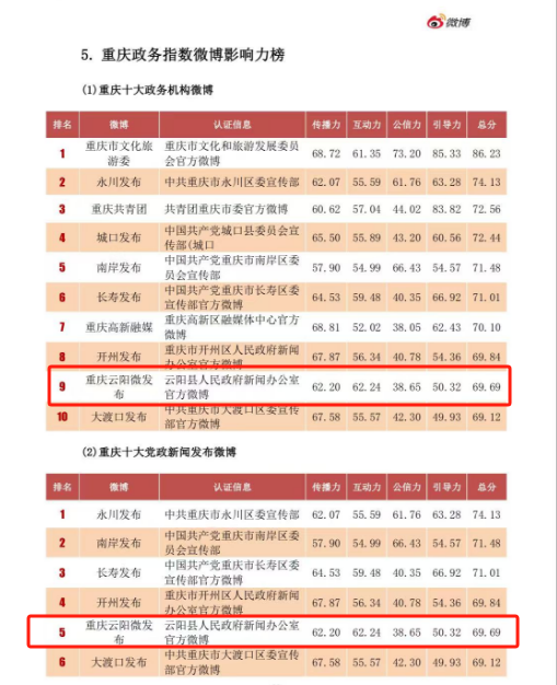 重庆十大党政新闻发布微博排名第5