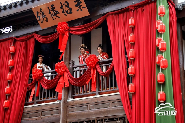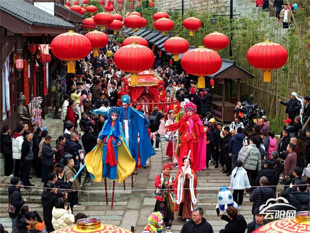身着传统服饰的表演者们踏着喜庆的鼓点沿街前行