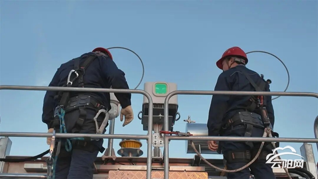 穿戴整齐后,他们开始测试免爬器。从地面到机舱,高度达115米,相当于38层楼高。免爬器缓缓运行,需要十来分钟才能到达。而在项目建设初期,这段路全靠他们手脚并用地攀爬。