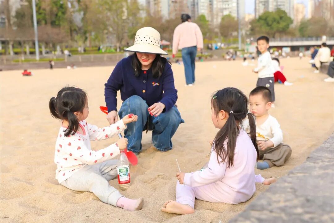 三五成群地蹲在一起堆沙堡、挖沙坑