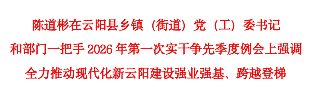 云阳网讯(记者 李歆宇 杨力)2月26日,云阳县乡镇(街道)党(工)委书记和部门一把手2026年第一次实干争先季度例会召开。县委书记陈道彬出席会议并讲话。他强调,要深入贯彻落实党的二十大和二十届历次全会精神,深化落实全市区县委书记和部门一把手2026年第一次季度例会和全市“新春第一会”精神,突出稳进提质、改革创新、除险固安、强企富民工作导向,持续深化党建统领“885”工作机制,全力推动现代化新云阳建设强业强基、跨越登梯,奋力实现“十五五”开门红。