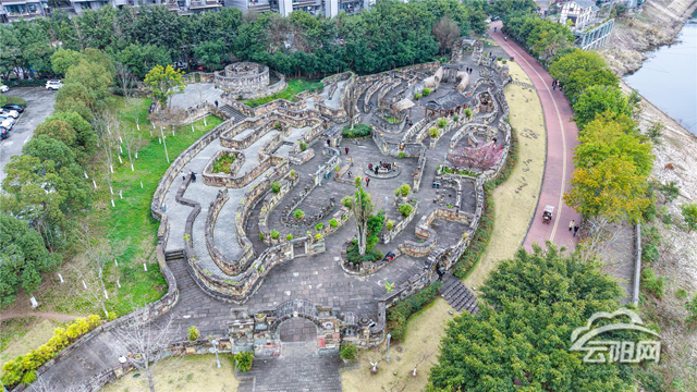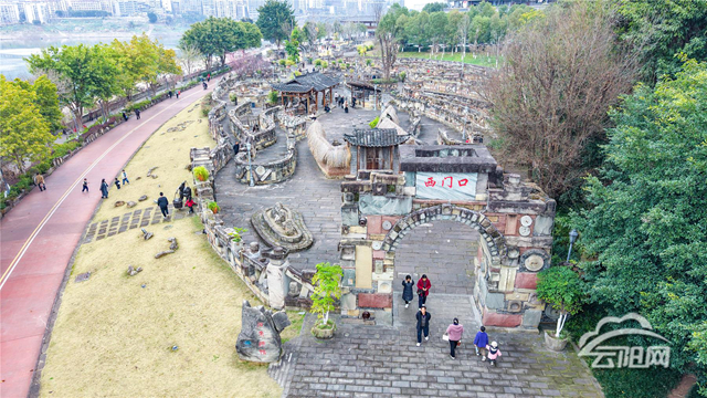 走进公园,一座由石磨、石碾、水缸、碓窝等老物件砌成的巨大迷宫映入眼帘。这些物件都是从云阳各乡镇搜集而来,总面积约5000平方米,迷宫景观墙总长约1400米,设计精巧。据悉从东门走到西门共有380种走法;从东门走到西门再走到南门,一共有1300多种走法。充满了趣味与挑战。公园入口沿用了云阳老县城的地名,如“大东门”“西门口”,许多市民穿梭其间时,仿佛又看到了往昔的街景。