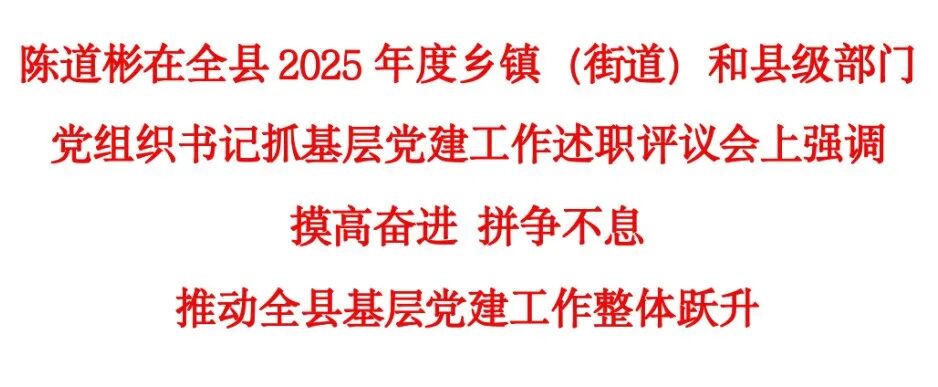 云阳网讯(记者 丁鑫 乐阳)2月27日,我县召开2025年度乡镇(街道)和县级部门党组织书记抓基层党建工作述职评议会。县委书记陈道彬主持并讲话。他强调,要深入贯彻党的二十大和二十届历次全会精神,全面贯彻习近平总书记关于党的建设和党的自我革命的重要思想,认真落实市委“新春第一会”、全市区县党委书记抓基层党建述职评议会部署要求,以服务建设新时代市域党建新高地为牵引,以持续修复净化政治生态为重点,以树立和践行正确政绩观为关键,深化推进加强党的全面领导、全面加强党的建设、全面从严治党在基层到边到底,深化“云阳见面·四象限工作法”强党建强基层,以高质量党建引领保障“一地一标三区两城”现代化新云阳强业强基、跨越登梯。