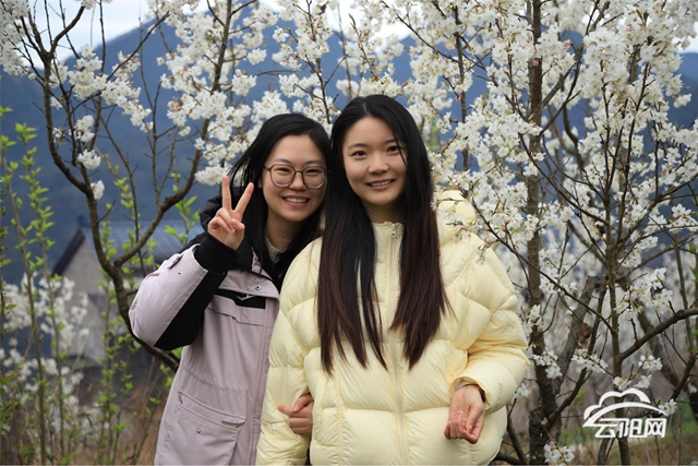 绵延的山坡上,雪白的樱桃花海与村庄相互掩映,恬静安详。漫步林间,白色、粉色的花朵簇拥枝头,微风拂过,空气中散发出阵阵清甜的香气。游客们徜徉花海,在层层叠叠的花枝前拍照留念,享受春日美好时光。