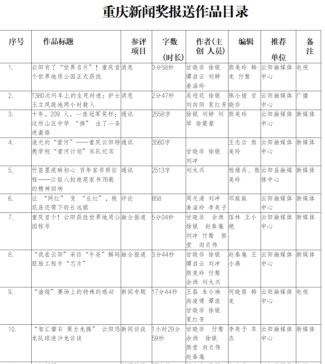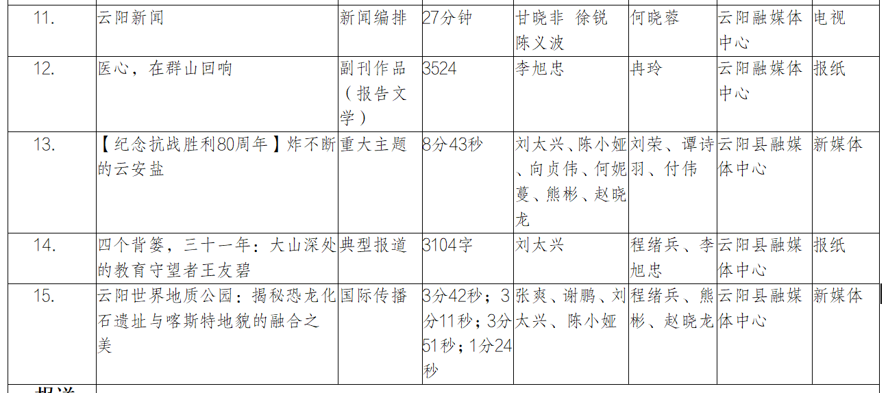 根据中共重庆市委宣传部、重庆市新闻工作者协会印发的《关于开展第28届重庆新闻奖评选工作的通知》,经初评,现推荐我单位15件作品参评第28届重庆新闻奖,现予以公示,欢迎社会各界监督。如有意见,可以向云阳县融媒体中心反映。