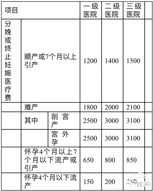 产前检查费按限额标准报销,一级医院报销300元,二级医院报销400元,三级医院报销500元。