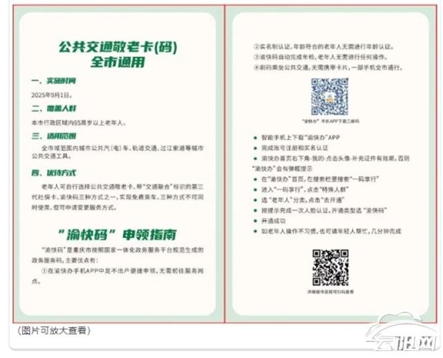 此外,市民还可通过申领手机“渝快码”敬老卡,或升级带有“交通联合”标识的三代社保卡,实现全市范围免费乘坐公共交通工具。需要提醒的是,新型公交敬老卡、“渝快码”敬老卡与三代社保卡三种方式中,每位市民仅可选择其中一种办理,已有其一者无法再办理另外两种。具体办理方法如下: