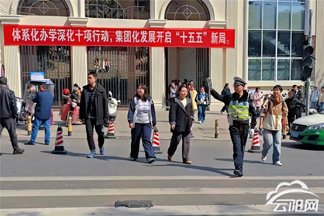 “师傅,车子往前开一点,不要停在正门口。”“这位家长,摩托车请靠边,让孩子先过。”陈凤楚站在路中间,一边打手势引导车辆有序停放、即停即走,一边提醒骑电动车的家长戴好头盔。文诗金则守在人行横道旁,弯腰牵起低年级学生的手,协助老师护送他们安全过马路。