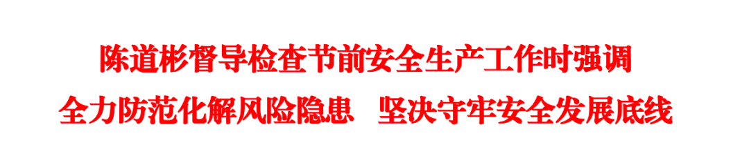 4月3日,县委书记陈道彬带队督导检查节前安全生产工作。他强调,要深入学习贯彻习近平总书记关于安全生产的重要论述,认真落实党中央决策部署和市委工作要求,始终坚持人民至上、生命至上,以“时时放心不下”的责任感,严之又严、细之又细抓好各项安全责任措施落实,坚决防范化解各类风险隐患,确保人民群众生命财产安全和社会大局平安稳定。