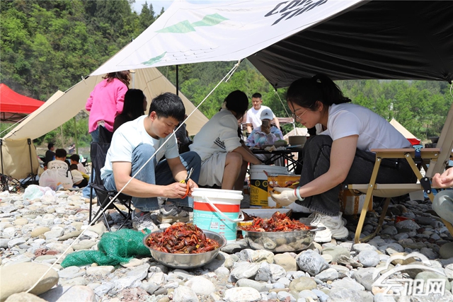 近日,记者走进鱼泉镇木瓜村露营基地,只见清澈的河水缓缓流淌,孩子们卷起裤腿在浅水区嬉戏玩水,水花四溅,笑声不断;大人们则在灶台旁忙着切菜生火,锅铲声、谈笑声交织在一起。不一会儿,饭菜香气随风飘散,欢声笑语回荡在河岸之间。