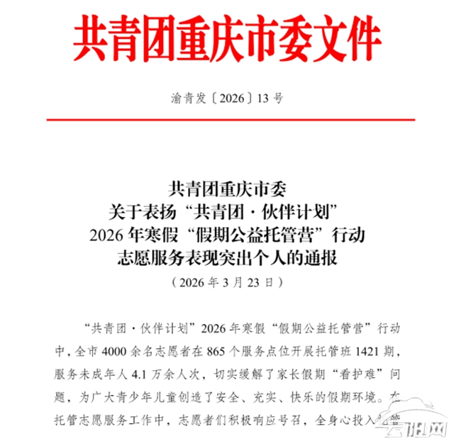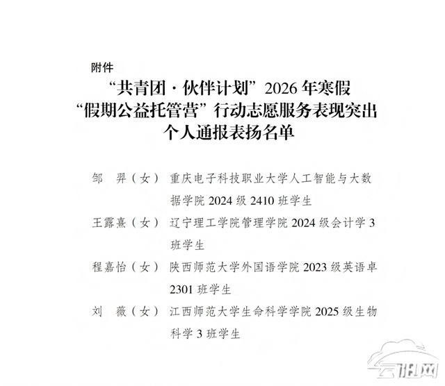 云阳网讯(记者 谢月 刘琴)近日,共青团重庆市委印发《关于表扬“共青团·伙伴计划”2026年寒假“假期公益托管营”行动志愿服务表现突出个人的通报》,对全市在寒假托管志愿服务中表现优异的181名个人予以通报表扬。其中,来自云阳的邹羿、王露熹、程嘉怡、刘薇4名优秀志愿者光荣上榜,充分展现了新时代云阳青年挺膺担当、服务社会的良好风貌。