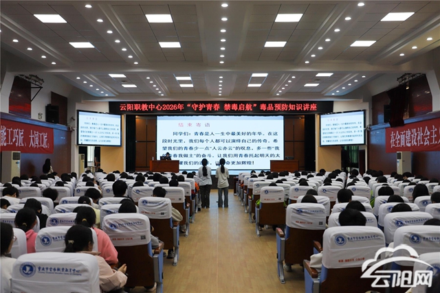 云阳网讯 (记者 谭启云) 近日,云阳职教中心举行2026年“守护青春 禁毒启航”毒品预防知识讲座,本次活动旨在进一步增强青少年识毒、防毒、拒毒意识,筑牢校园禁毒防线。